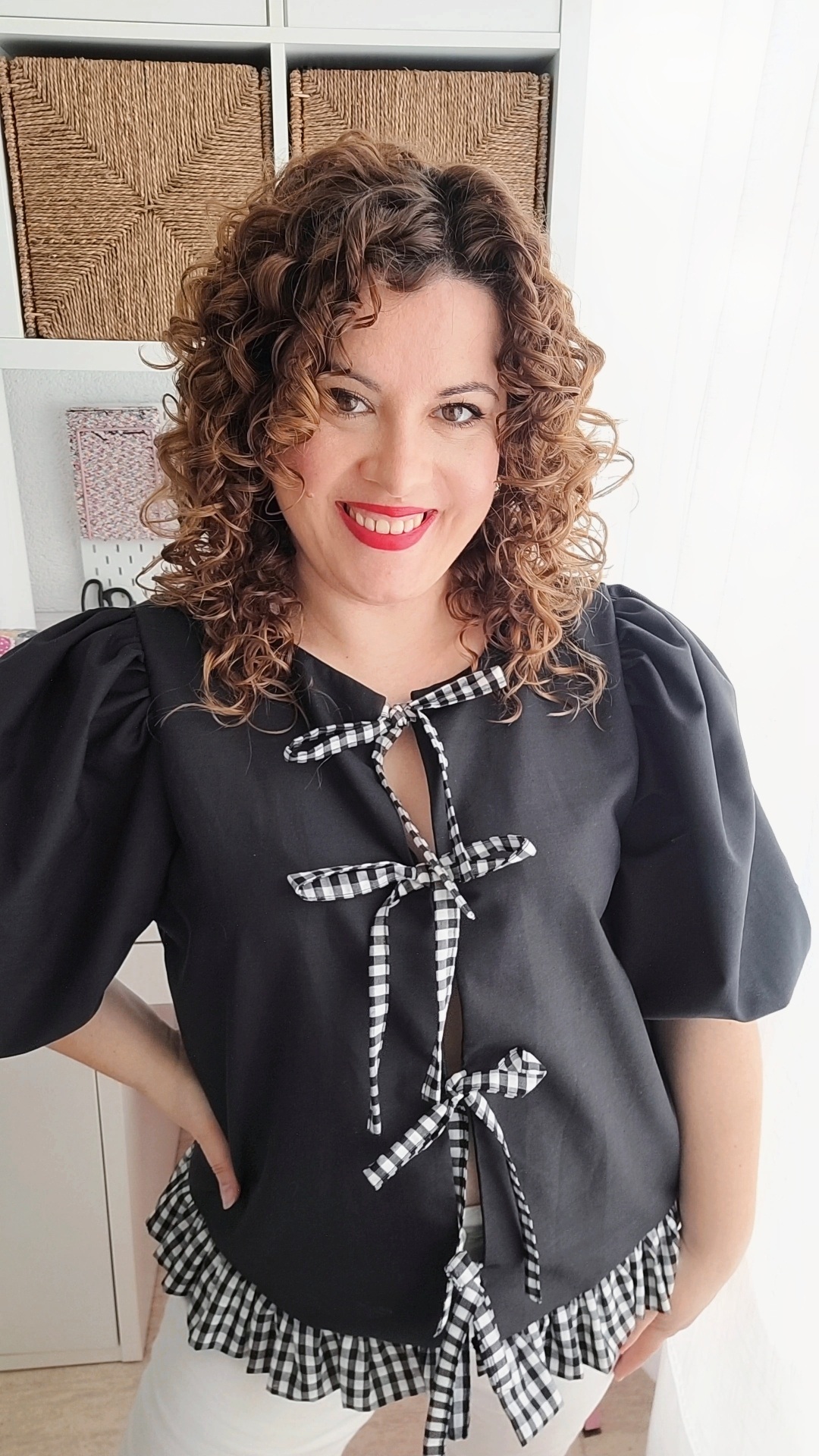 Esta semana vamos a aprender a confeccionar paso a paso la blusa ELSA en mi canal de Youtube EL BOTÓN DORADO. Es una blusa de corte recto, abierta por delante y con lazos para anudarla, lo que le da un aire sensual. Tiene mangas globo y en el bajo un volante a juego con los lazos del delantero.