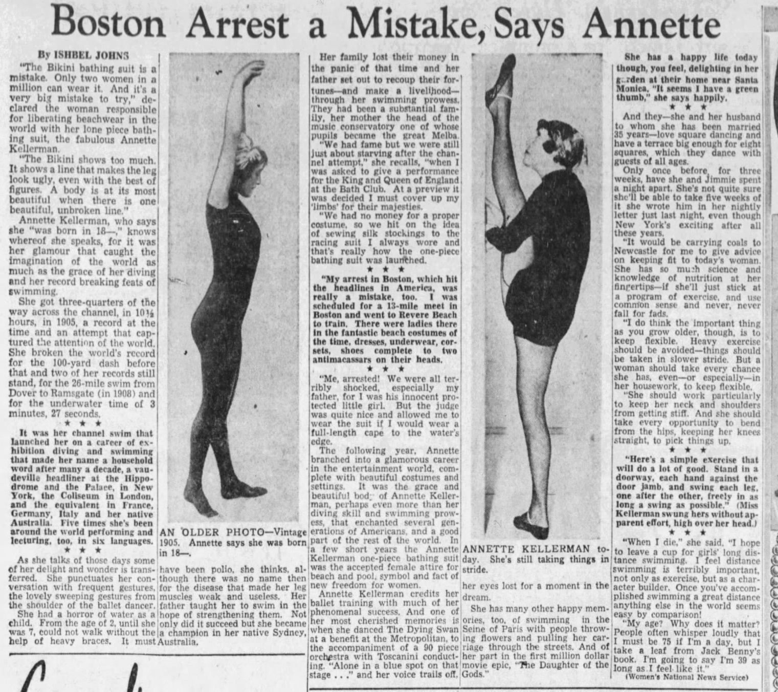“The bikini bathing suit is a mistake,” she said in the Globe article. “The bikini shows too much. It shows a line that makes the leg look ugly, even with the best of figures. A body is at its most beautiful when there is one beautiful, unbroken line.”