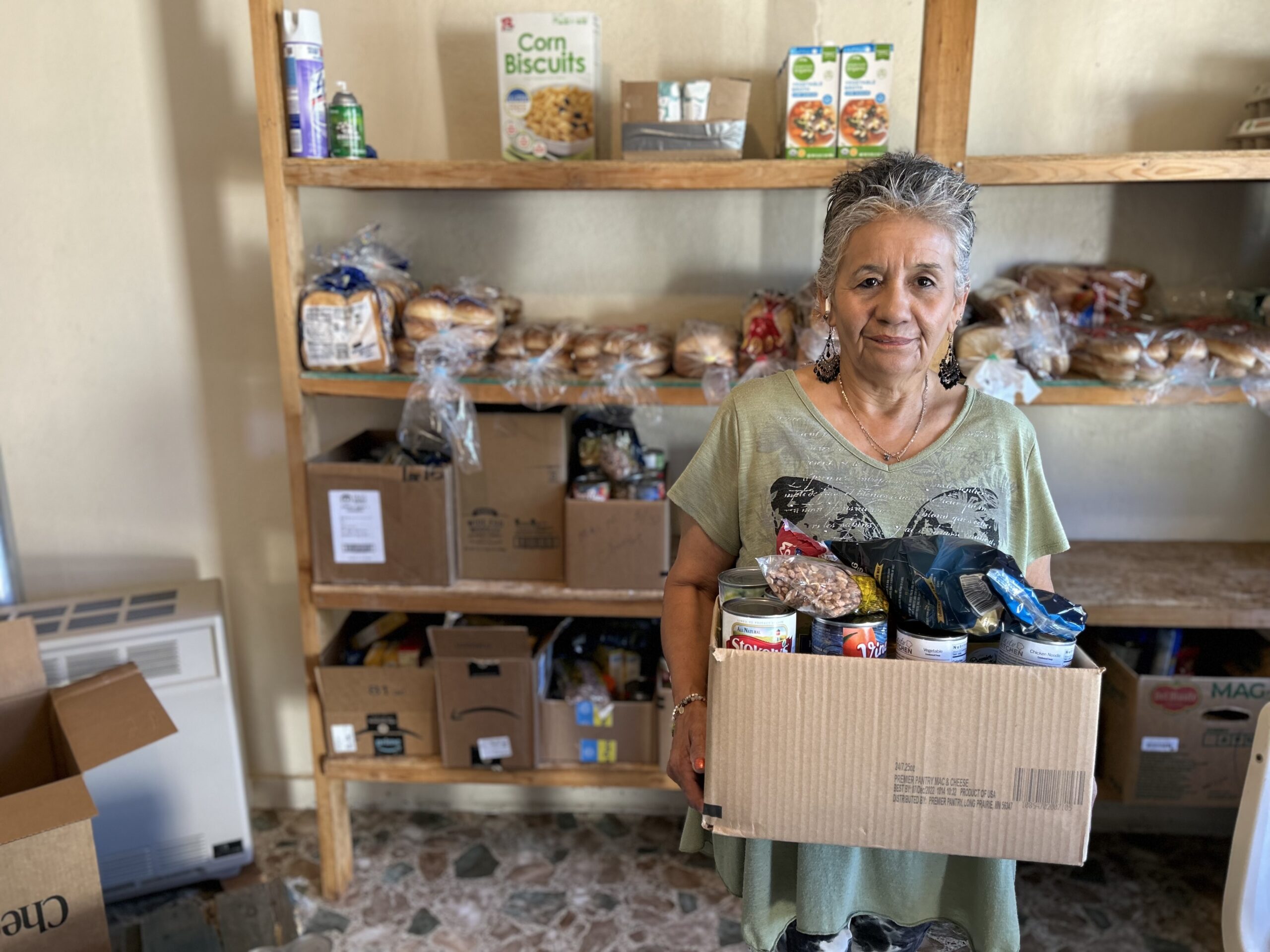 At Capulin Food Pantry, neighbors can visit and take home boxes of canned goods, bread products, and produce. Many neighbors walk to the pantry, so Tina always makes sure to have boxes and bags available for people to use. And if she has extra non-food items like hygiene products or clothes, she sets those out too.
